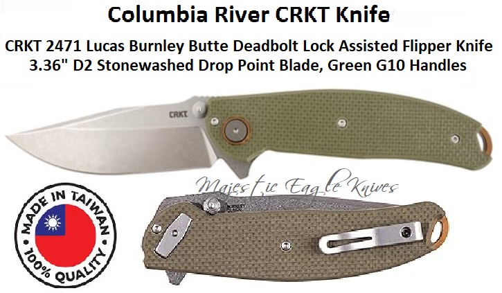 Columbia River Knife & Tool > Columbia River Knife and Tool: CR2471 CRKT Lucas Burnley Butte Deadbolt Lock Assisted Flipper Pocket Knife 3.36" D2 Stonewashed Drop Point Plain Blade, Green G10 Handles