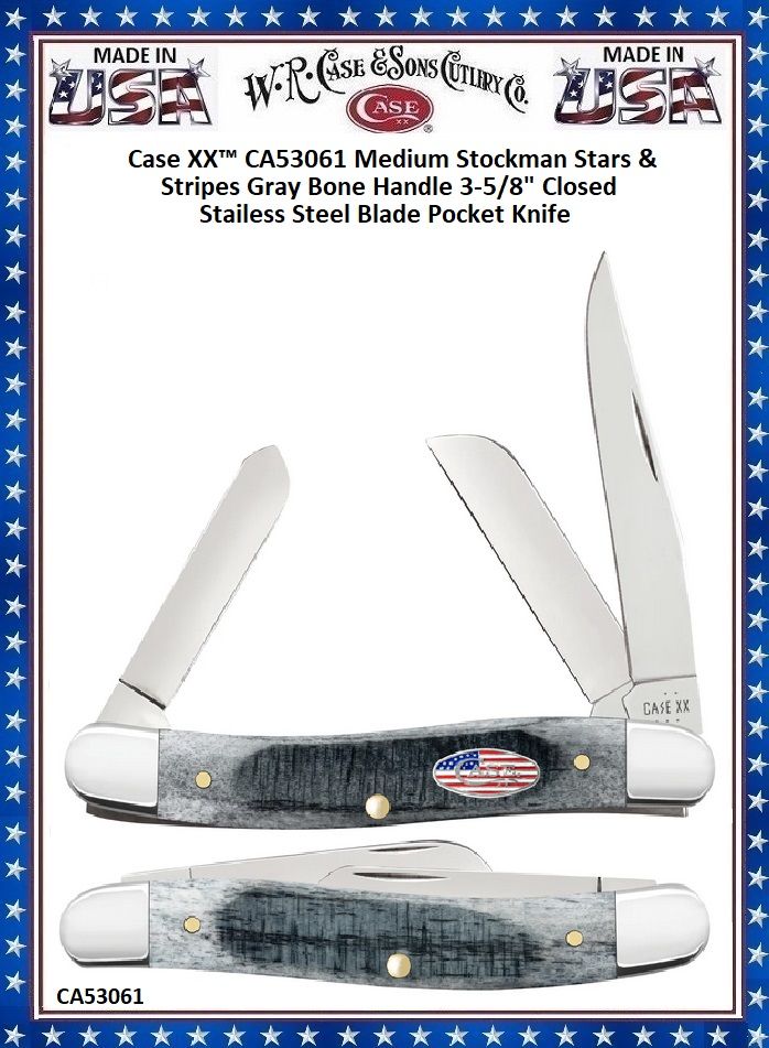 W.R. Case & Son's Cutlery CA53061 Case XX™ Medium Stockman Stars & Stripes Gray Bone Handle 3-5/8" Closed Stainless Steel Blade Pocket Knife! T his classic American Case Medium Stockman is about 3 5/8 inches long (folded/closed) and weighs approximately 2.4 ounces. The handle is Sawcut jigged Gray Bone with a Nickel Silver Oval Stars & Stripes Inlay shield. The bolsters are Highly polished Nickel Silver. This knife utilizes a 2 1/2" Clip blade, 2" Sheepsfoot Coping blade and 1 3/4" Spey blade. Stamped with pattern number 6318 SS, the blade material is Tru-Sharp Surgical Stainless Steel with a mirror-polished finish. This Medium Stockman is a professional-grade tool that comes with a Limited Lifetime Manufacturer's Warranty and is not designed nor intended to be used on or against humans. So, whether you're hunting for authentic cutlery to collect, a top quality knife to give as a gift, or a superior tool to use Don't Let This Treasure Get Away!